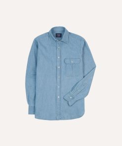 Built for both utility and understated style, this rugged shirt moves seamlessly from workshop to weekend. Practical yet effortless, it is designed to be anything but a chore to wear.|Cut from a 5.7oz Japanese denim, it features a curved hem, single-button cuffs, and a military pleated chest pocket, perfect for keeping essentials close without weighing down your trousers. Every detail, from the fisheye mother of pearl buttons to the single-needle construction, reflects Drake’s hallmark attention to quality.