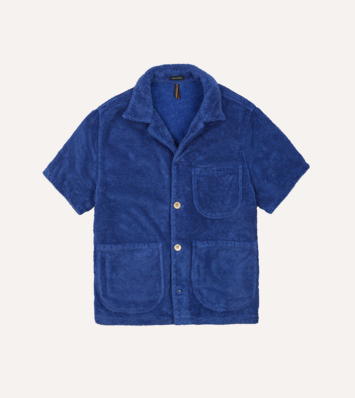 The safari shirt is constructed from a 12.3oz cotton towelling cloth from Italy, that will fade, age, and patinate beautifully, and features such pragmatic details as three patch pockets, an open collar and two internal pockets.