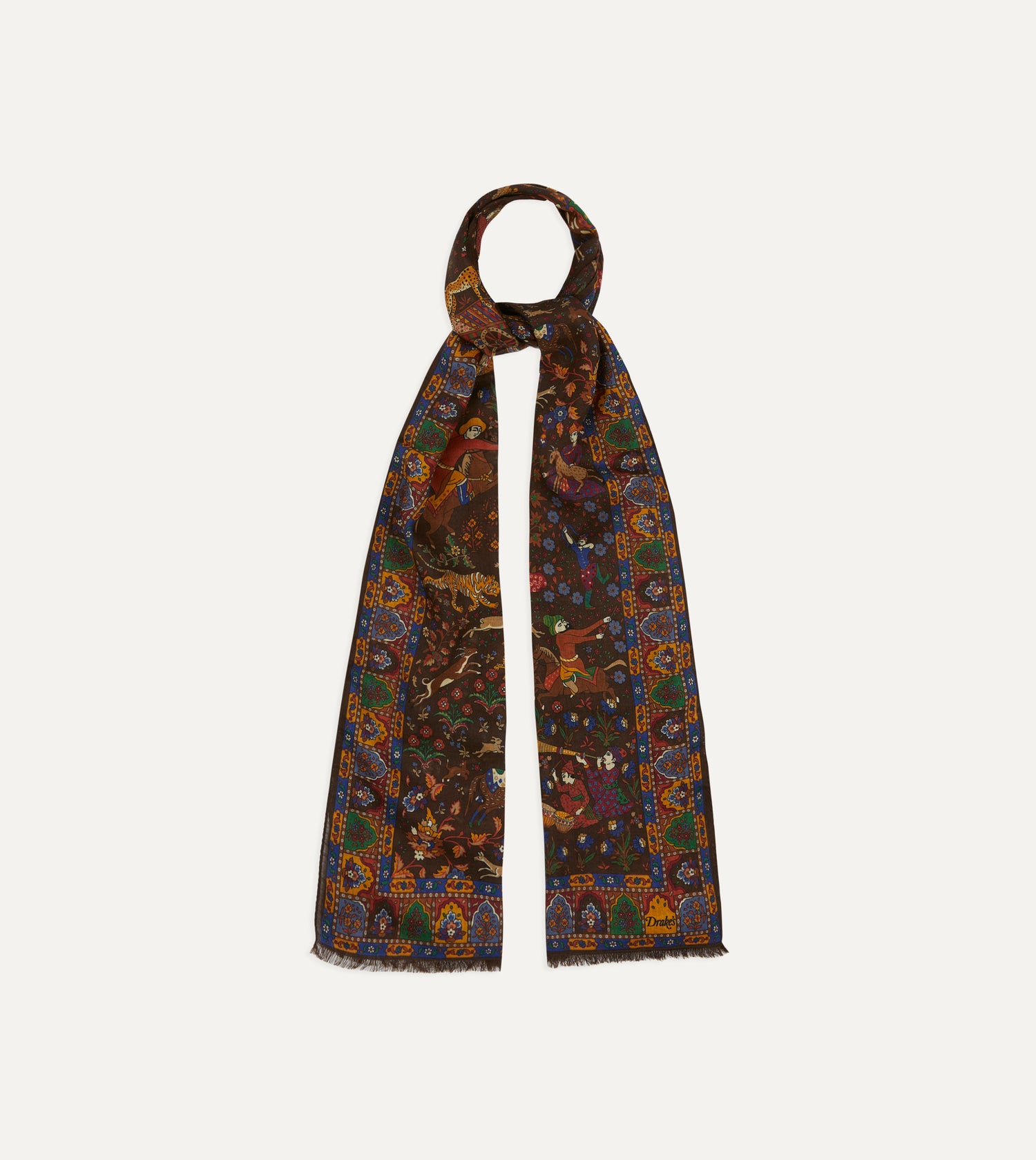 Printed scarves were the first things that Drake’s produced back in the late 1970s, and we continue to make them to this day.|Taken from our extensive design archive, this motif, featuring our famous Mughal hunter print has been vividly applied to a blend of wool and silk.