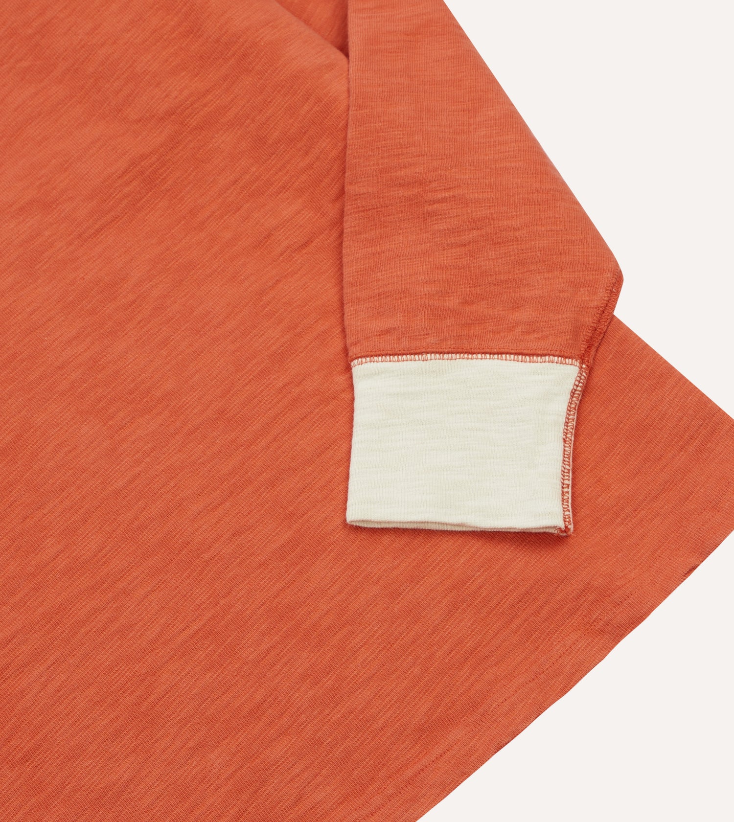 An enduring piece of vintage sportswear, reimagined for our collaboration with New Balance, our rugby shirt takes cues from both classic athletic wear and the refined spirit of our shirting, striking a careful balance between rugged and elegant.|Cut from a substantial cotton flamé fabric with a subtly slubby texture and a touch of stretch, it offers both comfort and tactility. The pattern, developed with our shirtmakers, features a trimmer silhouette and a higher armhole, designed to sit comfortably beneath tailoring or worn casually with denim or chinos.|For this limited edition version, a chevron panel at the front nods to sporting heritage, while a bold ‘77’ at the back marks the year of Drake’s founding, a subtle wink to both provenance and play.