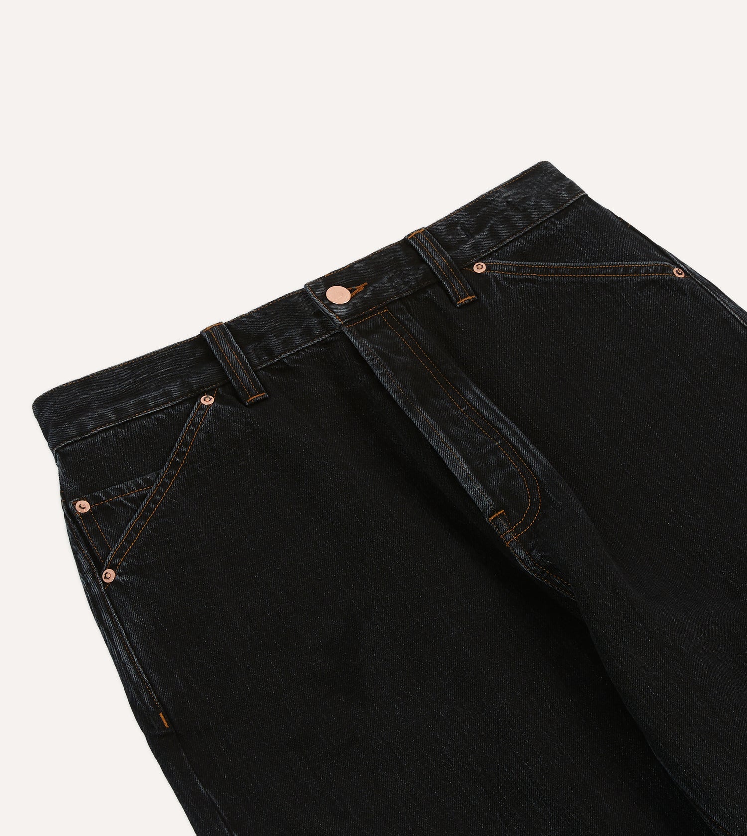 This classic pair of jeans is constructed from a high quality 12.3oz selvedge denim from Okayama, Japan. The denim is woven on an extremely rare shuttle loom, and is dyed using a natural process.|Cut with a slightly higher rise and a relaxed, tapered fit, the jeans are finished with copper rivets and a unique slanted pocket design.