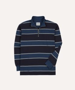 The rugby shirt has steadily become a staple of our collections, and this time around is no different. Cut from a densely knitted cotton, our idiosyncratic take on an enduring bit of vintage sportswear has a substantial feeling to it, as well as a certain tactility.|For our rugbies, we created a pattern inspired by our shirts by working closely with our shirtmakers to create a fit that is a bit less baggy and sporty, and more refined and elegant, finished with a quarter-zip collar to split the difference between a sweatshirt and a classic rugby.|The resulting pattern was one with a slightly trimmer body and a higher armhole, making the shirts perfect for wearing with tailoring, unlike their more traditionally shaped cousins.