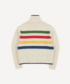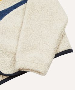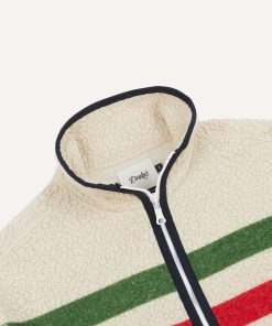 Cut from a dense Italian boucle fabric, this fleece jacket takes its cues from vintage outdoor gear and old Ivy League sideline style. The bands of colour that run across it recall traditional North American trade blankets: functional objects elevated by pattern, and now an enduring design language.|Boxy, practical, and made for layering, it’s the sort of thing that works just as well thrown over a rugby shirt as it does under a big coat when the weather really turns.
