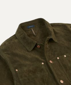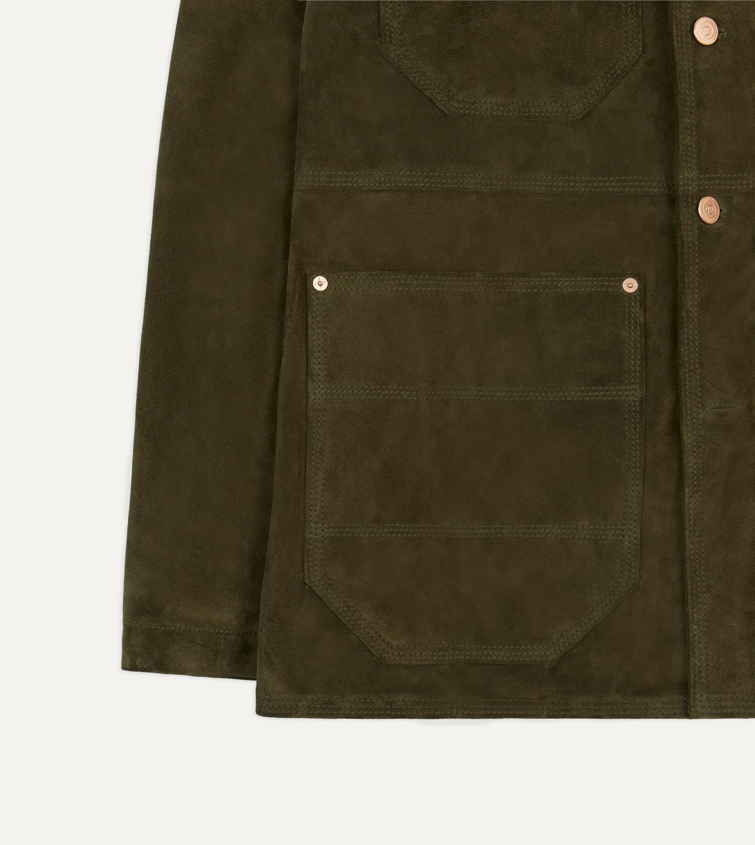 The welder is a classic piece of workwear, firmly in the key of Drake’s.|Modelled on our classic five-pocket chore, with tonal triple needle stitching and brass hardware throughout, we reinforced the pockets and panelling and selected a supple and lightweight Italian suede to add a bit of tactility (and manoeuvrability) and reinforced the pockets and panelling.|With a broad, stiff collar and a simple, straight shape, it is a beautiful example of when form and function meet.