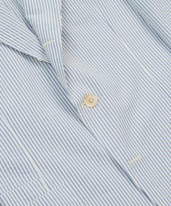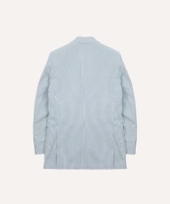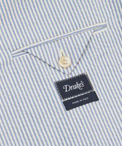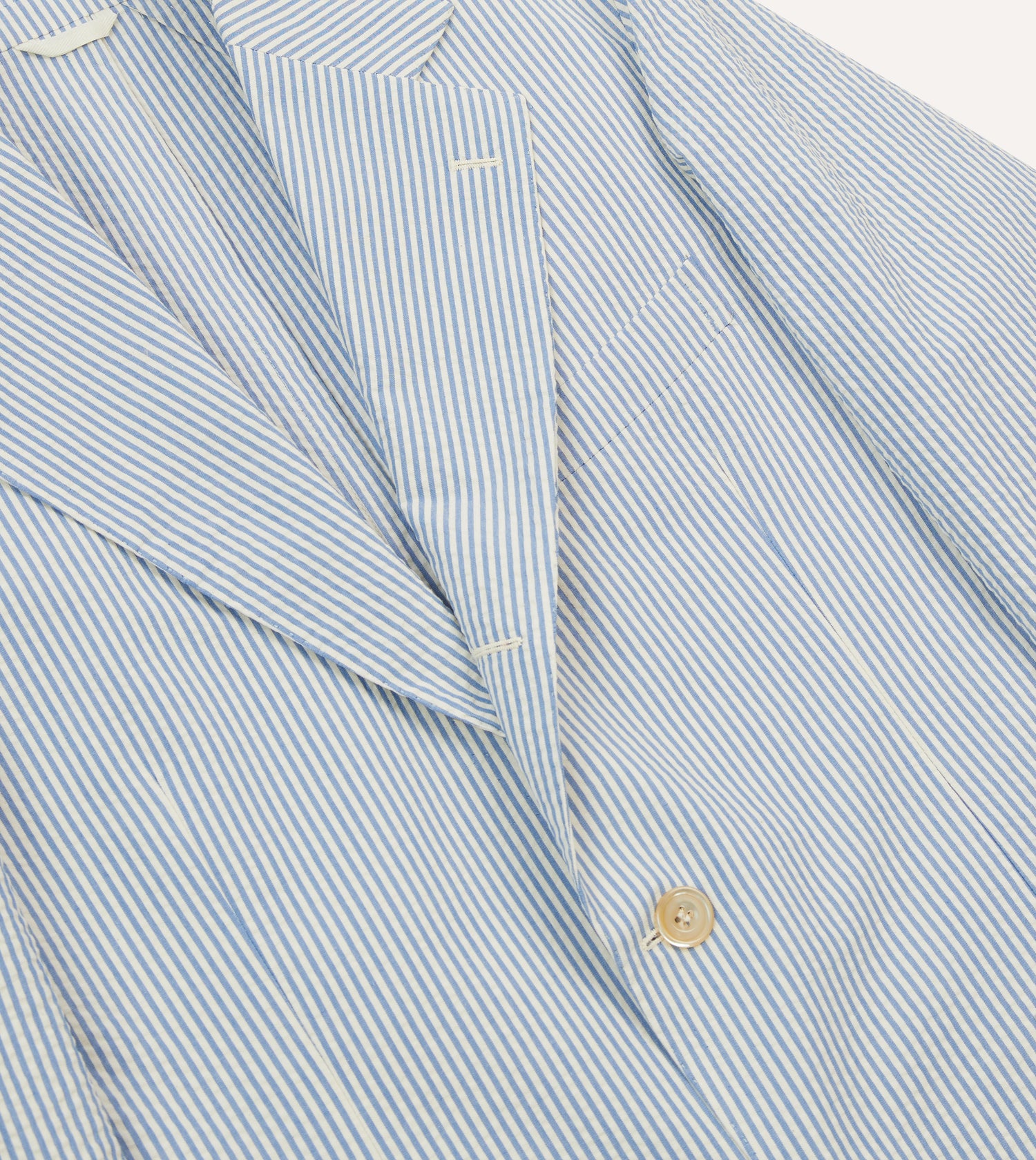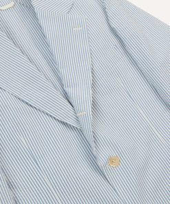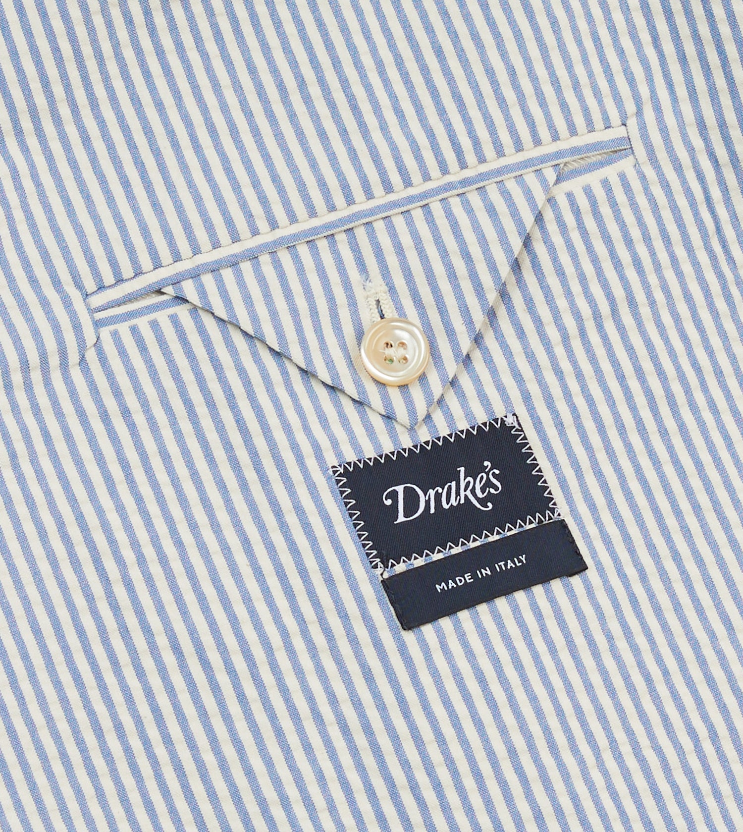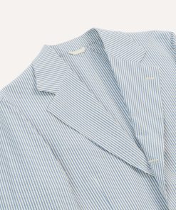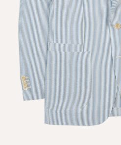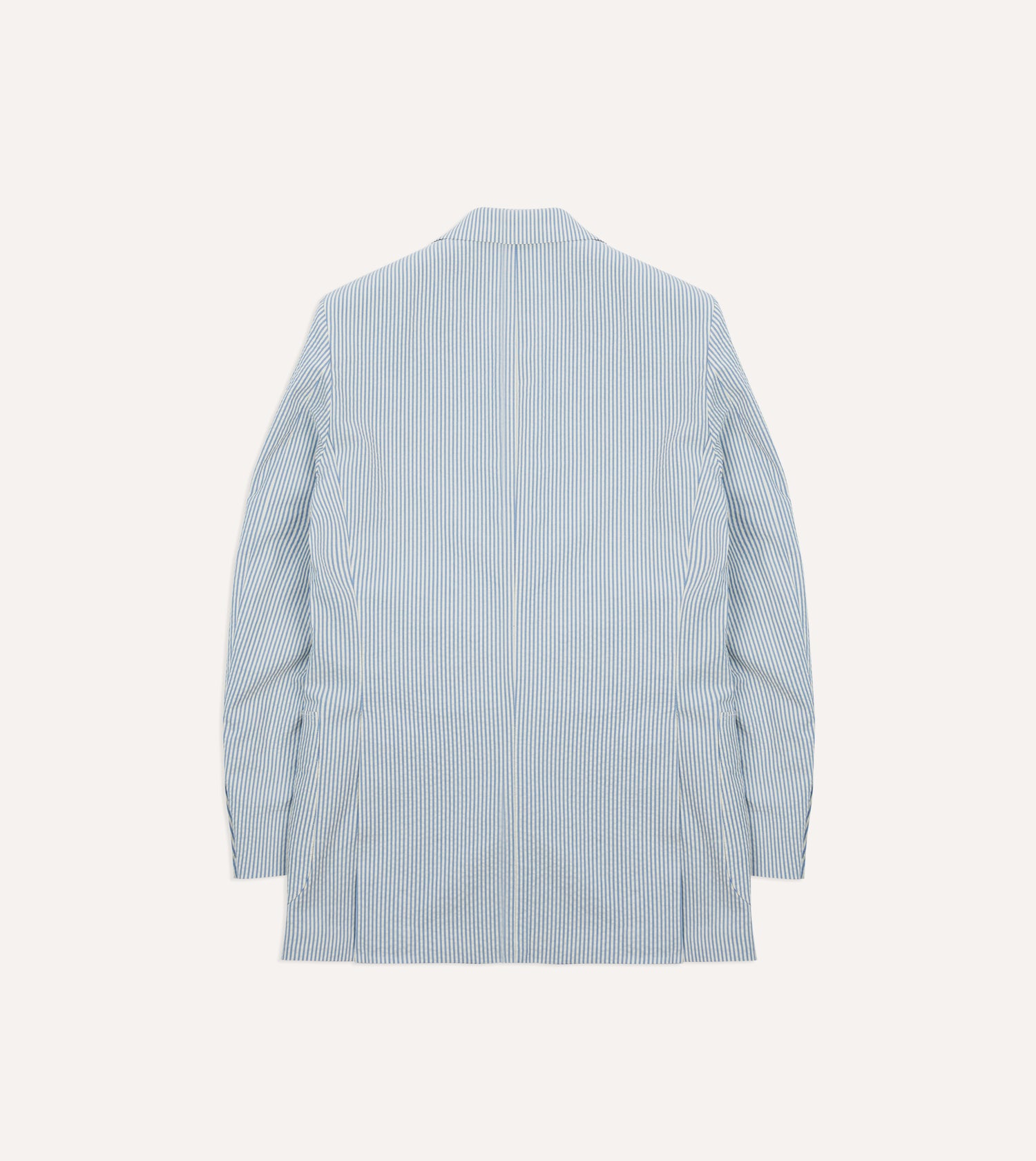 A tactile and lightweight 7oz seersucker fabric combines with an unlined Italian construction for the optimum in lightweight tailoring.|Our house style features an unstructured silhouette, three-roll-two button stance, patch pockets and an soft shoulder, balancing convention with sartorial savoir-faire.|The Barchetta breast pocket (named for its resemblance to a “little boat”) and twin front darts keep things orthodox, while double vents and a discreet ticket pocket bring an added element of utility.|Available as part of a suit, with matching trousers.