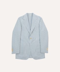 A tactile and lightweight 7oz seersucker fabric combines with an unlined Italian construction for the optimum in lightweight tailoring.|Our house style features an unstructured silhouette, three-roll-two button stance, patch pockets and an soft shoulder, balancing convention with sartorial savoir-faire.|The Barchetta breast pocket (named for its resemblance to a “little boat”) and twin front darts keep things orthodox, while double vents and a discreet ticket pocket bring an added element of utility.|Available as part of a suit, with matching trousers.
