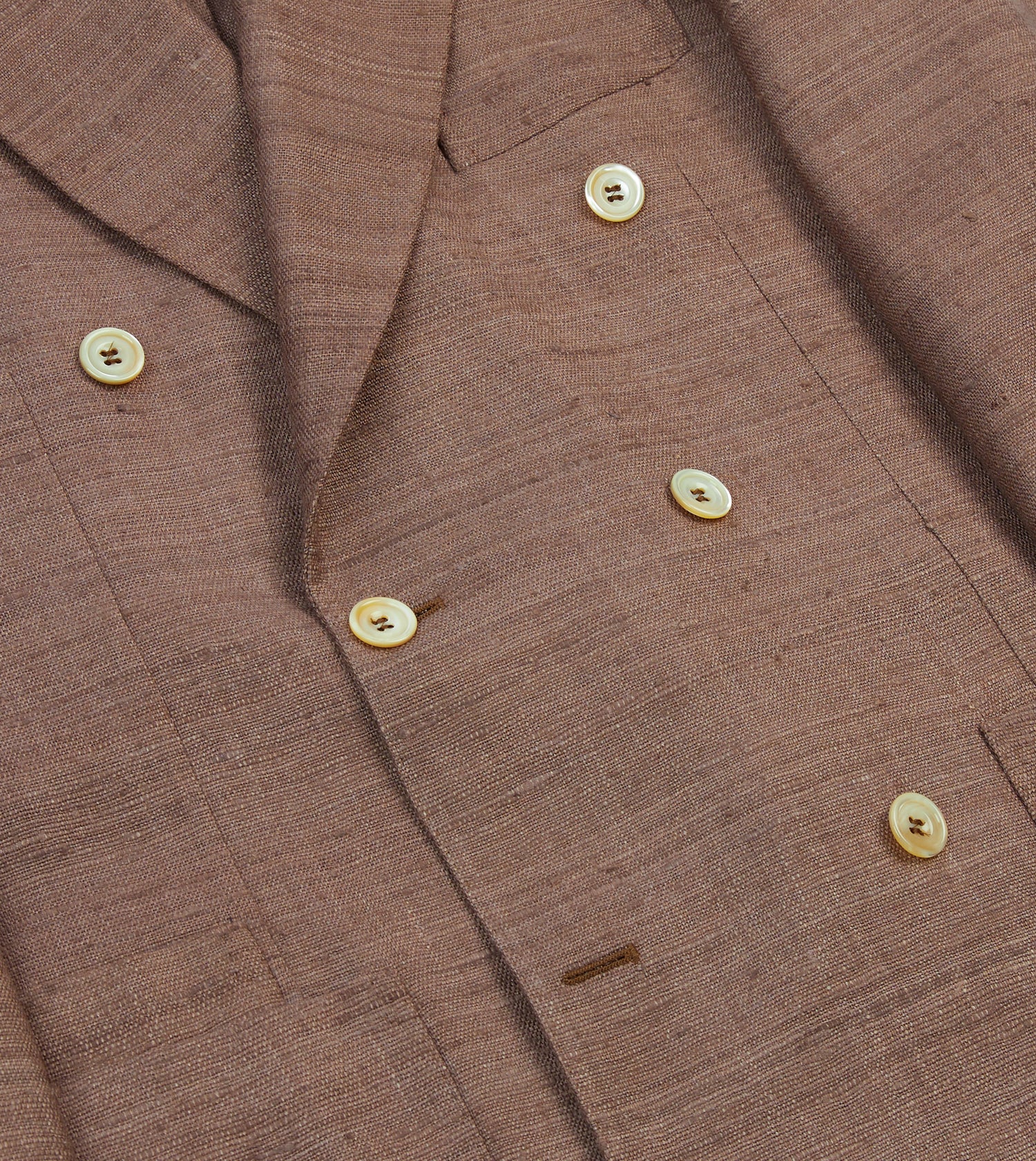 A timeless icon of the male wardrobe, embodying a louche and easy-wearing sense of style, the double-breasted blazer is a classic.|Ours is softly tailored in our house cut from raw spun tussah silk. The natural slub in the silk gives the jacket a great texture. With a four-button fastening, a slightly bellied lapel, patch hip pockets with our signature patch ticket pocket, and our signature soft shoulder ensuring a highly versatile piece of tailoring.