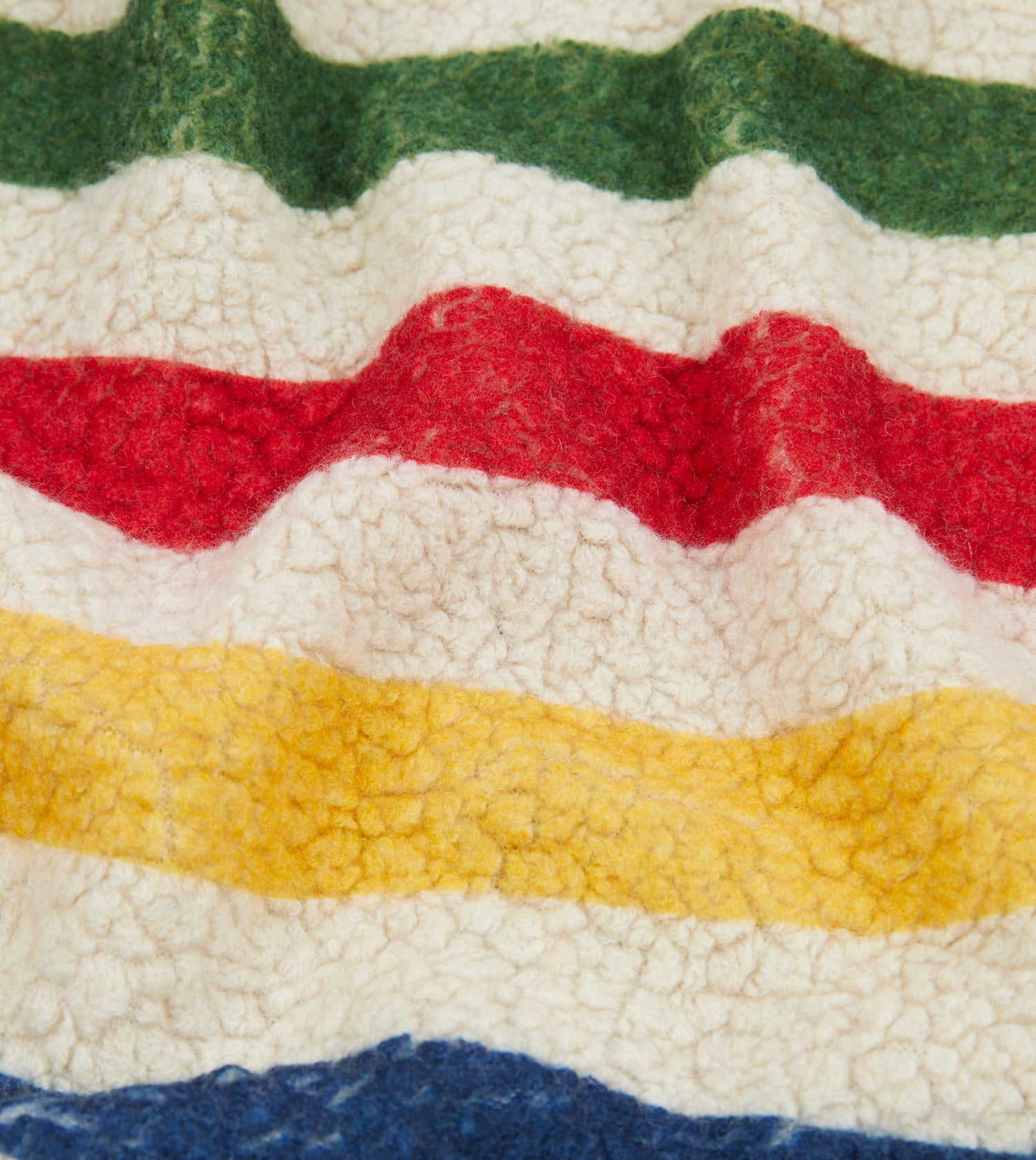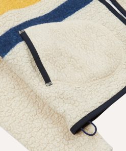 Cut from a dense Italian boucle fabric, this fleece jacket takes its cues from vintage outdoor gear and old Ivy League sideline style. The bands of colour that run across it recall traditional North American trade blankets: functional objects elevated by pattern, and now an enduring design language.|Boxy, practical, and made for layering, it’s the sort of thing that works just as well thrown over a rugby shirt as it does under a big coat when the weather really turns.