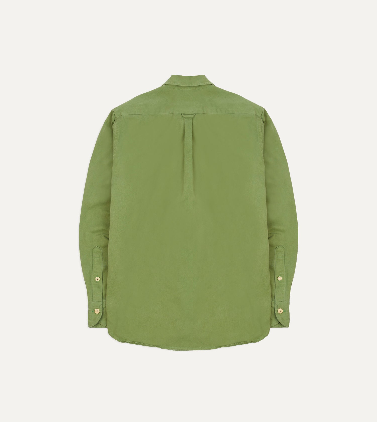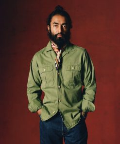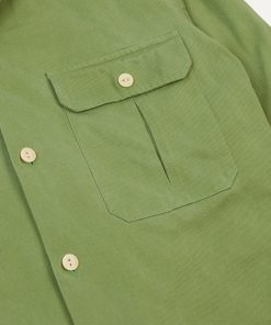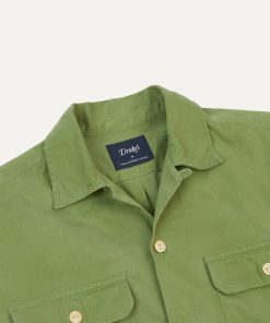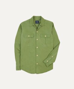 This rugged shirt, cut from a serviceable cotton twill, offers utility and urbanity in equal measure. Featuring two pleated, button-flap pockets for unburdened trousers, rounded cuffs and a camp collar ensuring fuss free mobility, and capped off with the same single-needle construction and mother of pearl buttons de rigueur to Drake’s shirting.
