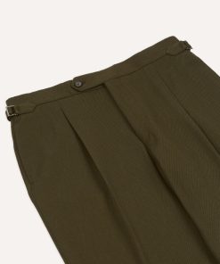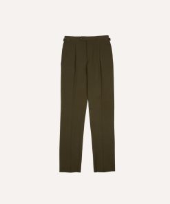 Our house trousers, cut with a mid-rise and single reverse pleats for ease and comfort. The leg falls clean with a gentle taper, offering a silhouette that feels sharp without being too slim.|Woven from a hybrid fabric combining the drape and natural elasticity of wool with the durability and casual ease of cotton, sourced from one of our favourite mills in Biella, considered by many to be the capital of Italian wool.|Details are understated but considered: an extended tab front with French bearer, side adjusters in lieu of belt loops, and an after-dinner split at the rear. Half-lined to the knee, with curtaining at the waistband, they’re made to sit neatly, wear easily, and stand the test of time, whatever you pair them with.