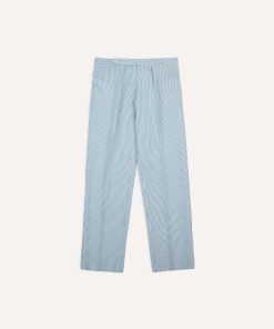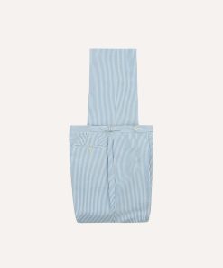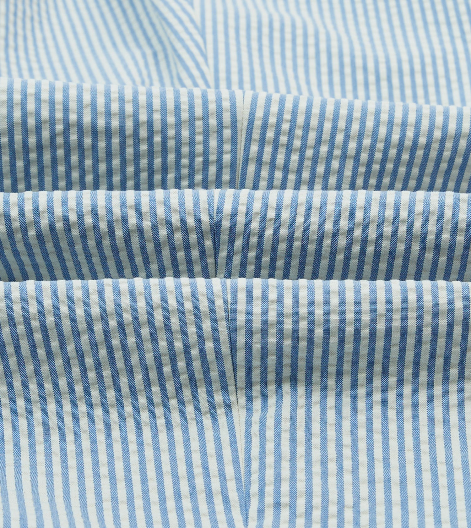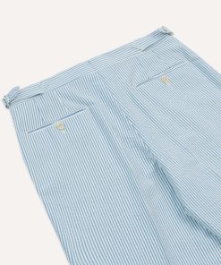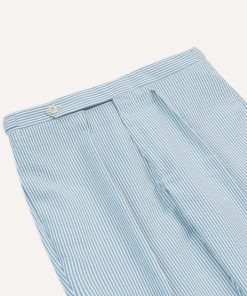 A tactile and lightweight 7oz seersucker fabric combines with an unlined Italian construction for the optimum in lightweight tailoring.|The half-lined trousers feature understated details such as an extended tab front, French bearer buttoning with interior waistband curtaining, an after-dinner split to the rear, and side adjusters in lieu of belt loops.|Available as part of a suit, with matching jacket.